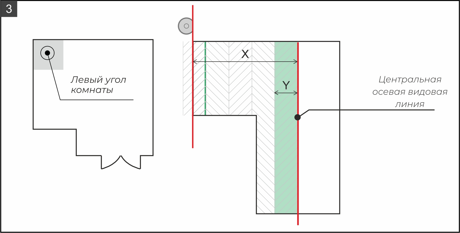 8.2. Укладка начинается с левого угла комнаты, поэтому необходимо измерить расстояние от центральной осевой видовой линии до левой стены (Х) и разделить его на ширину ряда (Y). Сделайте разметку будущих рядов и определите необходимость подрезки плашек у левой стены (рис. 3).